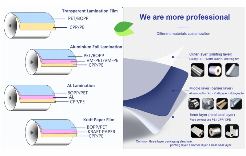 PET/PE, PA/PE, PET/OPP/PE, PET/VMPET/PE, etc. customized |