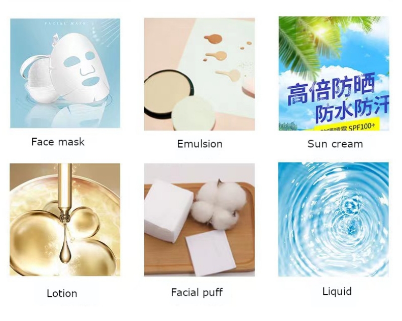 Facial mask, hand mask, cold compress, emulsion, sun cream, lotion, liquid, hand cream, shampoo, etc. |